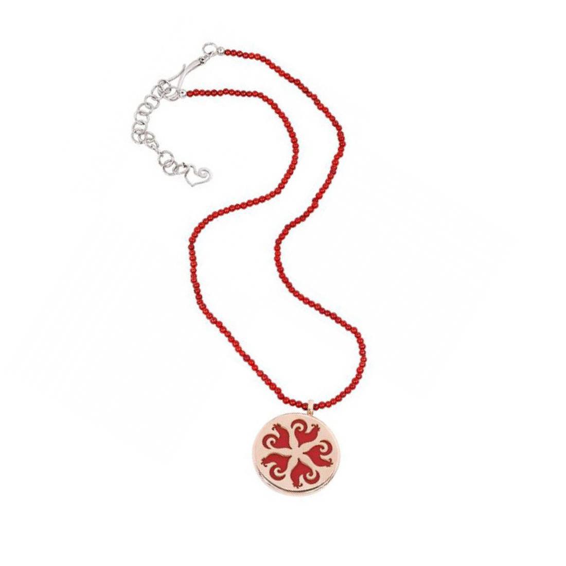 Collana Chantecler, collezione j'o', con perline in corallo e chiusura in argento, pendente in oro rosa e resina rossa. Misura regolabile da 32 cm a 40 cm.