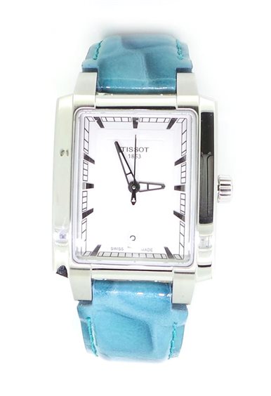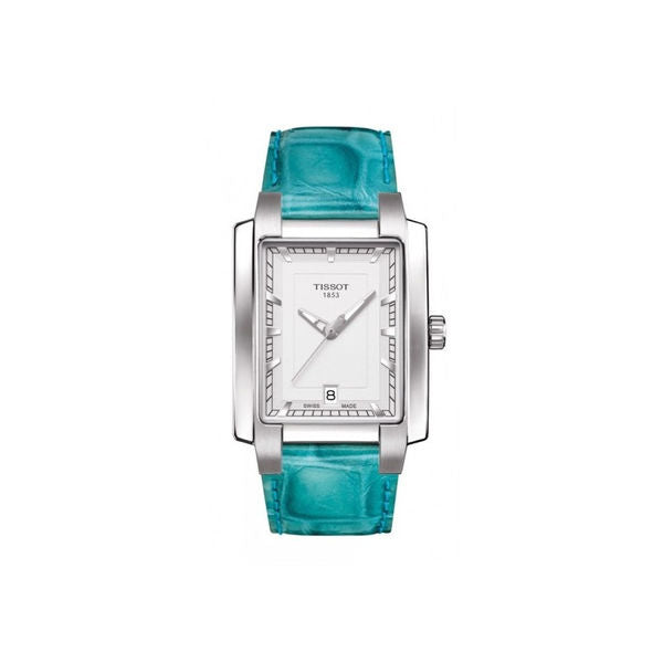 Rechteckige Damenuhr mit weißem Zifferblatt und türkisfarbenem Lederarmband