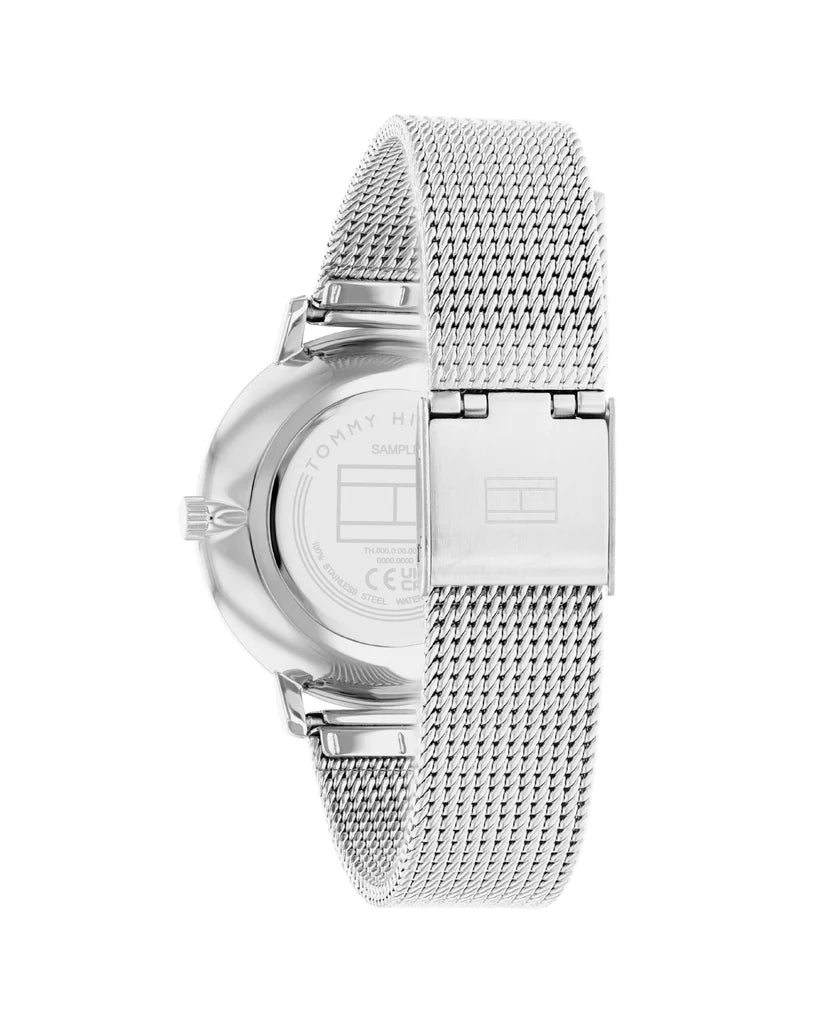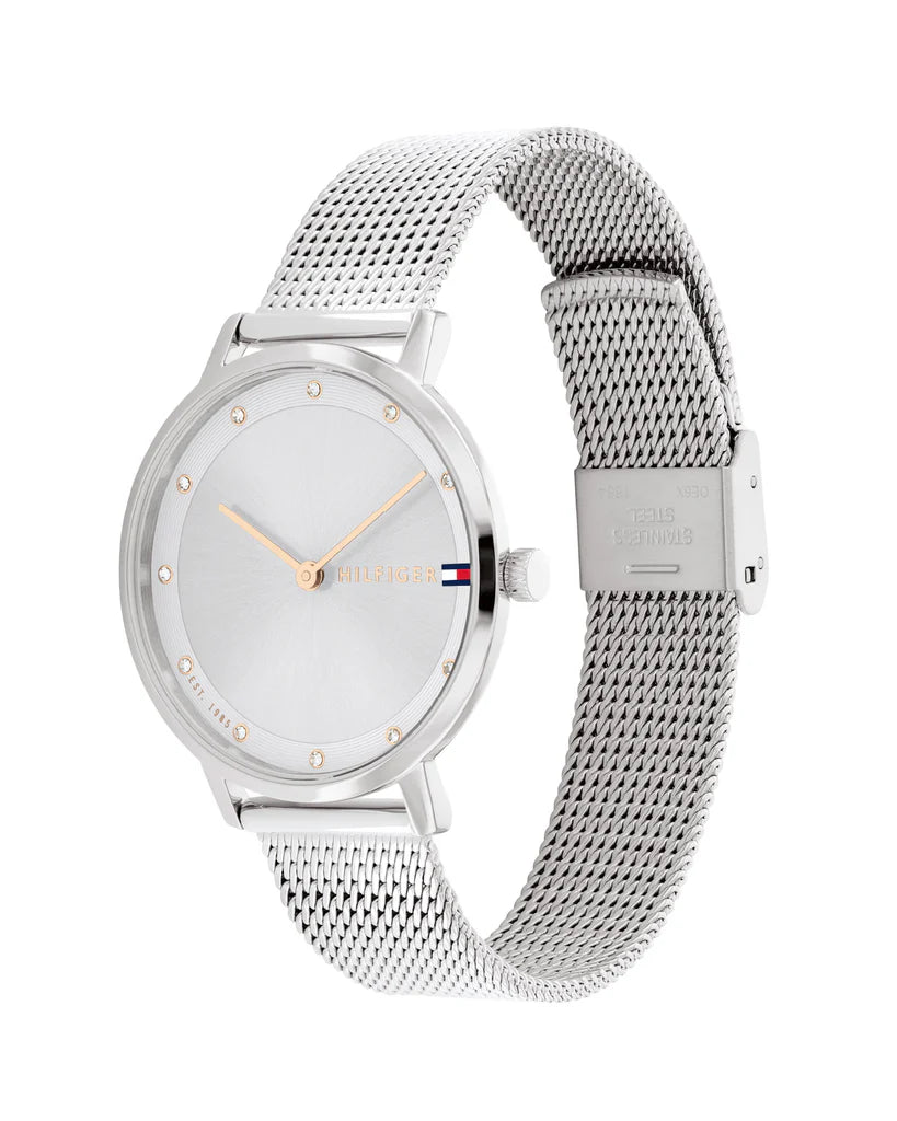 Analoge Damenuhr aus der Tommy Hilfiger Piper Kollektion. Diese 34-mm-Uhr verfügt über ein silbernes Edelstahlgehäuse, ein silbernes Zifferblatt und ein silbernes Edelstahlarmband. Sie ist wasserdicht bis 3 ATM.