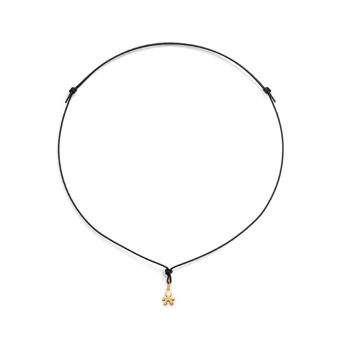 Anhänger mit Babysilhouette aus 18 Karat Gelbgold mit umweltfreundlicher schwarzer Kordel.