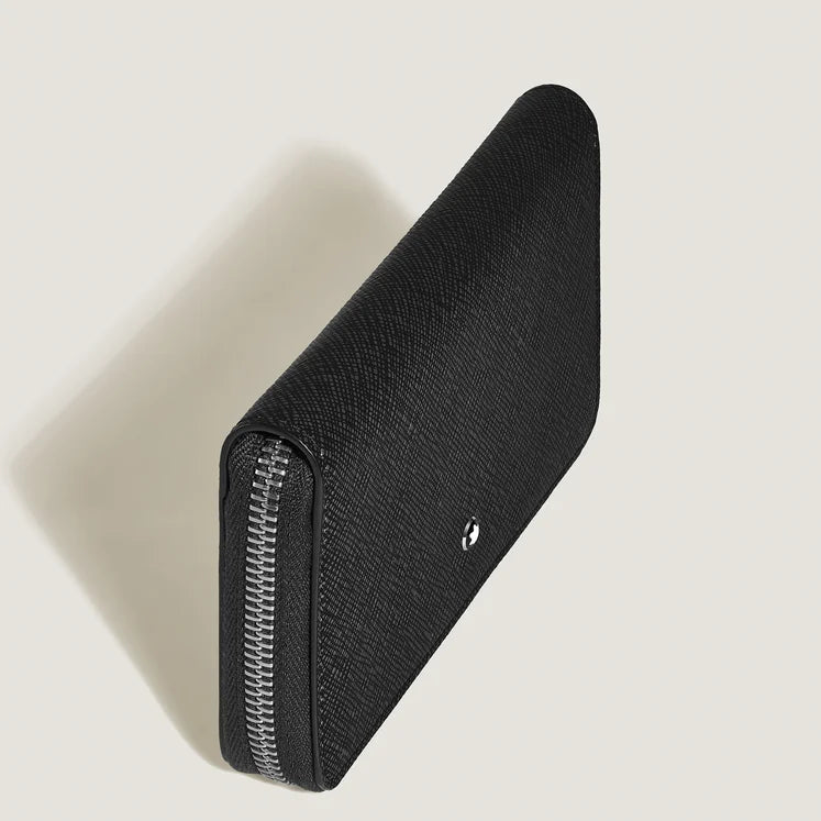 Dieses funktionale Portemonnaie mit Rundum-Reißverschluss vereint zeitlosen Stil und praktische Funktionalität. Es ist aus klassischem, schwarzem, geprägtem Sartorial-Leder gefertigt und verfügt über den markanten Reißverschlussschieber aus Metall in Form einer Feder – eine Hommage an die Schreibtradition von Montblanc. Im Inneren bietet das Portemonnaie zwölf Kreditkartenfächer, ein sicheres Münzfach mit Reißverschluss und drei zusätzliche Fächer für Quittungen oder andere wichtige Dinge.