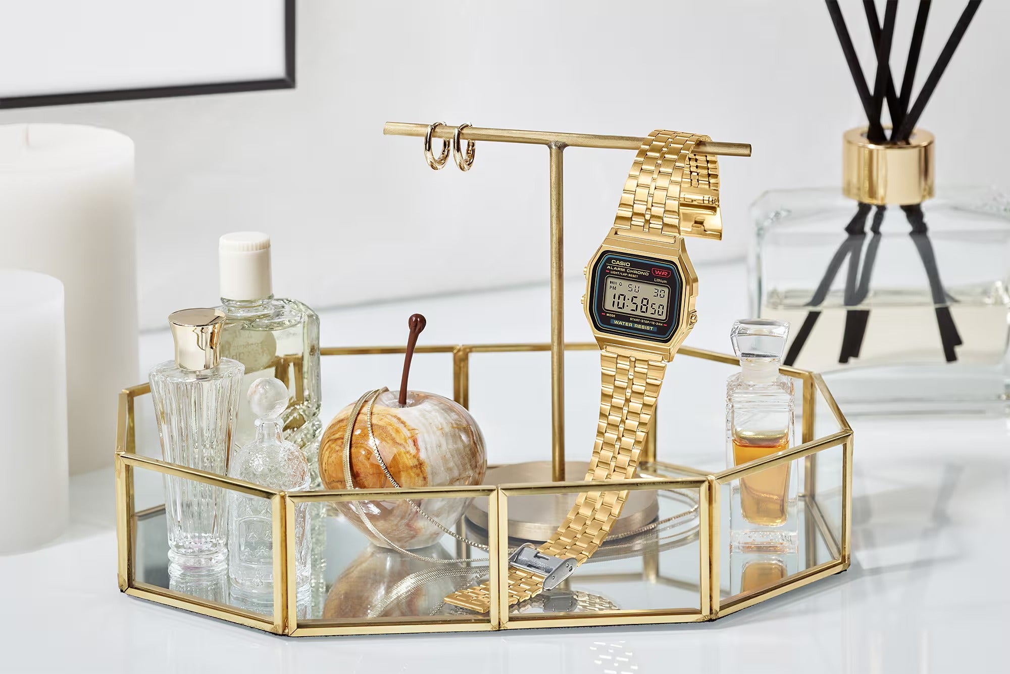 Diese klassische goldfarbene Digitaluhr ist zweifellos die perfekte Vintage-Wahl für alle, die mit den Modetrends Schritt halten möchten. Dieses goldfarbene Modell hat eine Batterielebensdauer von bis zu 7 Jahren und beeindruckt sowohl durch seine Funktionen als auch durch sein Design. Ein automatischer Kalender, eine Stoppuhr mit 1/100-Genauigkeit und ein täglicher Alarm sind nur einige der Hauptmerkmale des Vintage Iconic.a-Modells.
