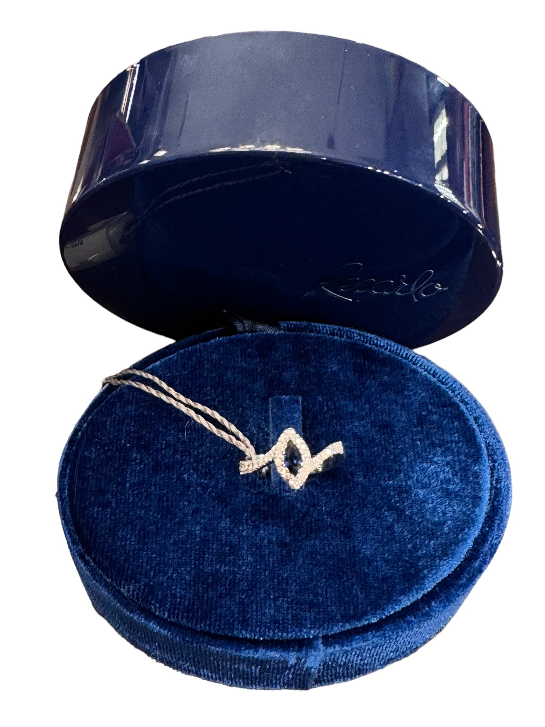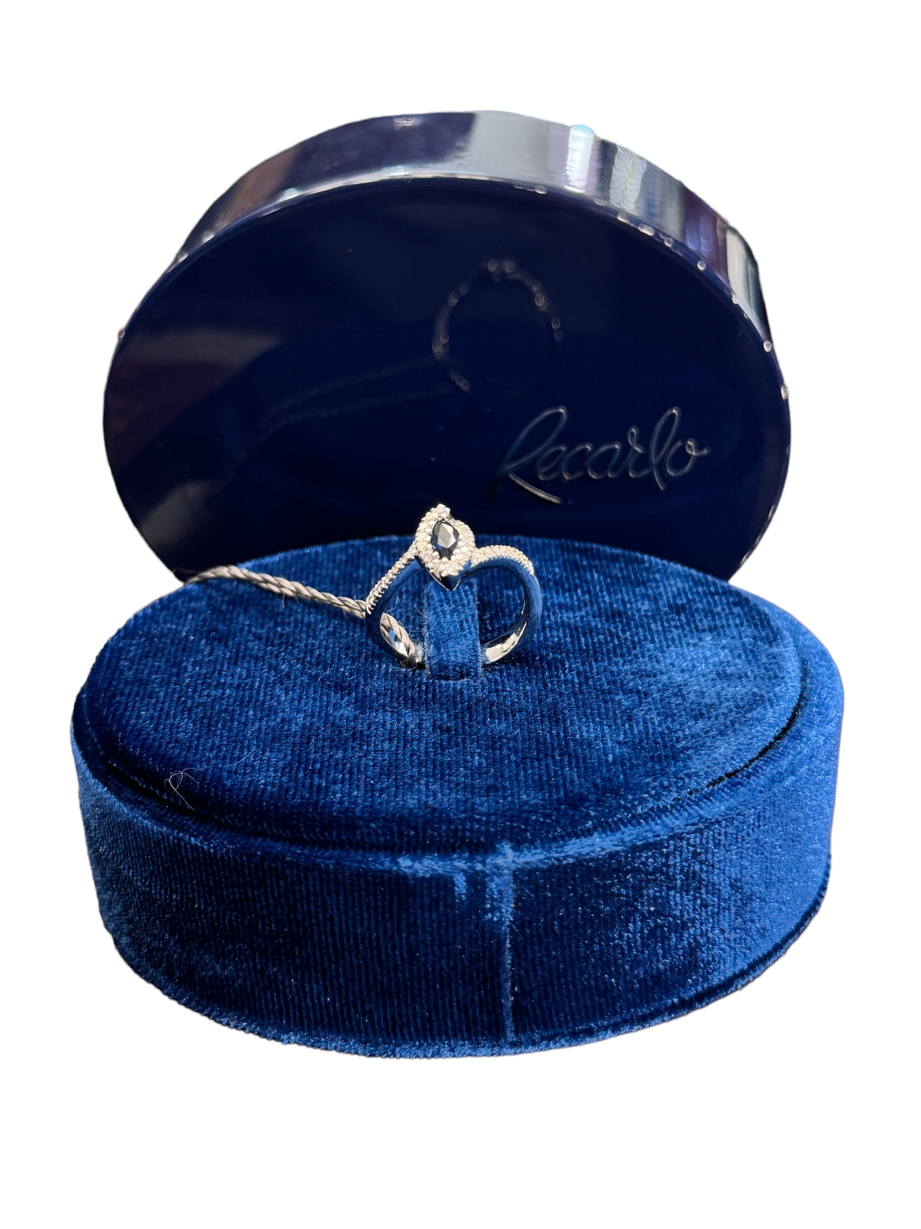 Anello in oro bianco e diamanti con zaffiro, con giro di diamanti sul gambo.